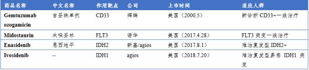 2017年以來,F(xiàn)DA先后批準了諾華Midostaurin、新基/agios Enasidenib及agios ivosidenib 等新型AML靶向治療藥物(見下表),為AML患者治療帶來了新的希望。