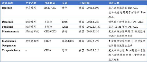 化療是ALL最主要的治療方法,靶向治療是部分具有特殊靶點患者的治療選擇,是近年來新開展的治療方法。目前獲批藥物主要有伊馬替尼、達沙替尼、泊那替尼等小分子靶向藥物。單抗藥物、細胞治療藥物在成人ALL治療中也取得了顯著效果。